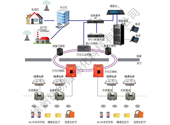 礦用無(wú)線通信系統(tǒng)由綜合語(yǔ)音服務(wù)器、錄音服務(wù)器、4G/5G核心網(wǎng)系統(tǒng)、上網(wǎng)行為管理系統(tǒng)、觸摸屏調(diào)度臺(tái)、地面無(wú)線基站、礦用本安型基站、礦用本安型手機(jī)、礦用隔爆兼本質(zhì)安全型電源、光纜等組成?;赩OLTE的高清音視頻通話與傳輸技術(shù),可進(jìn)行可視通話、視頻回傳和視頻推送等業(yè)務(wù),為礦井提供語(yǔ)音通信、數(shù)據(jù)傳輸、多系統(tǒng)融合調(diào)度、可視化調(diào)度等多種應(yīng)用功能。具備WIFI覆蓋、精確定位、運(yùn)輸管理、設(shè)備管理等多種應(yīng)用擴(kuò)展,真正實(shí)現(xiàn)萬(wàn)物互聯(lián)。